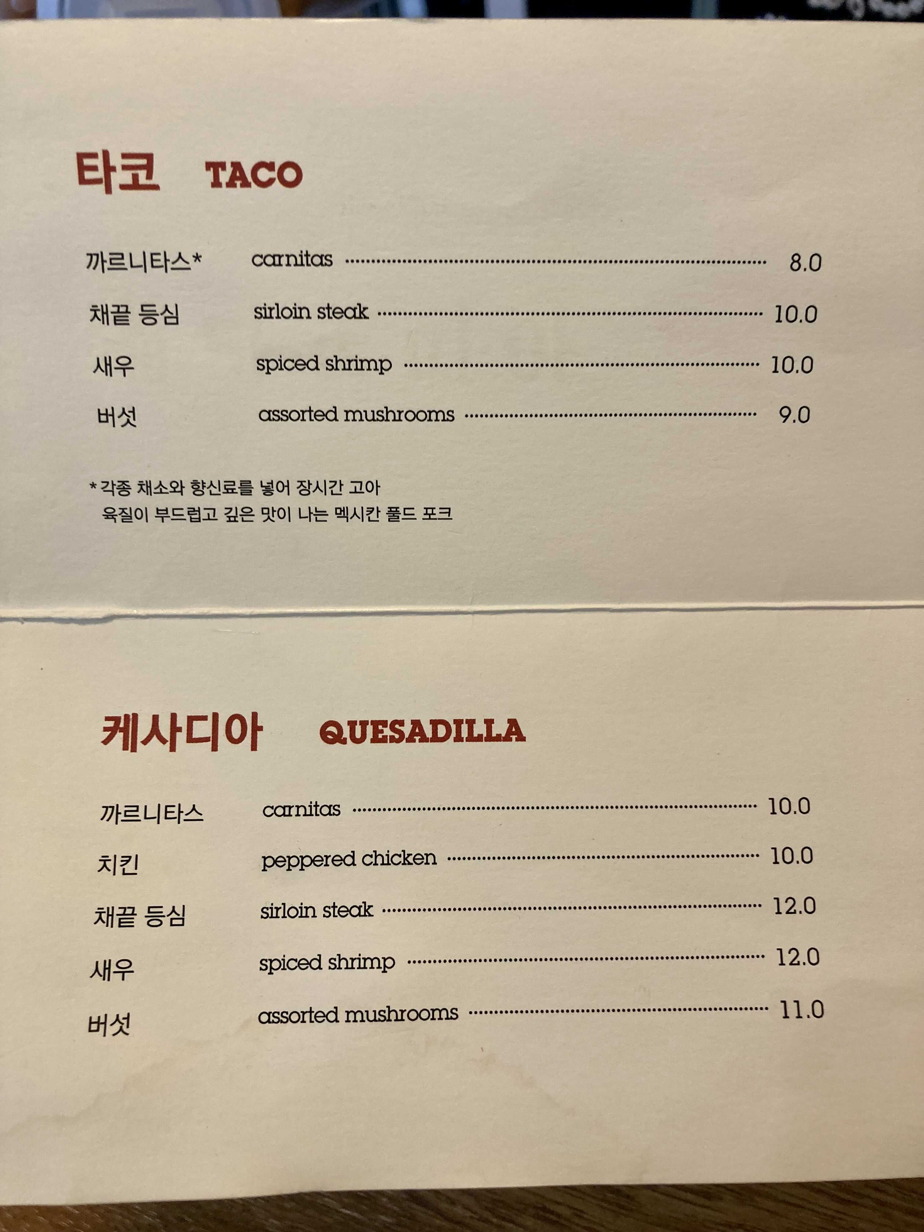 타코, 케사디아 (라고 써있지만 께사디아)