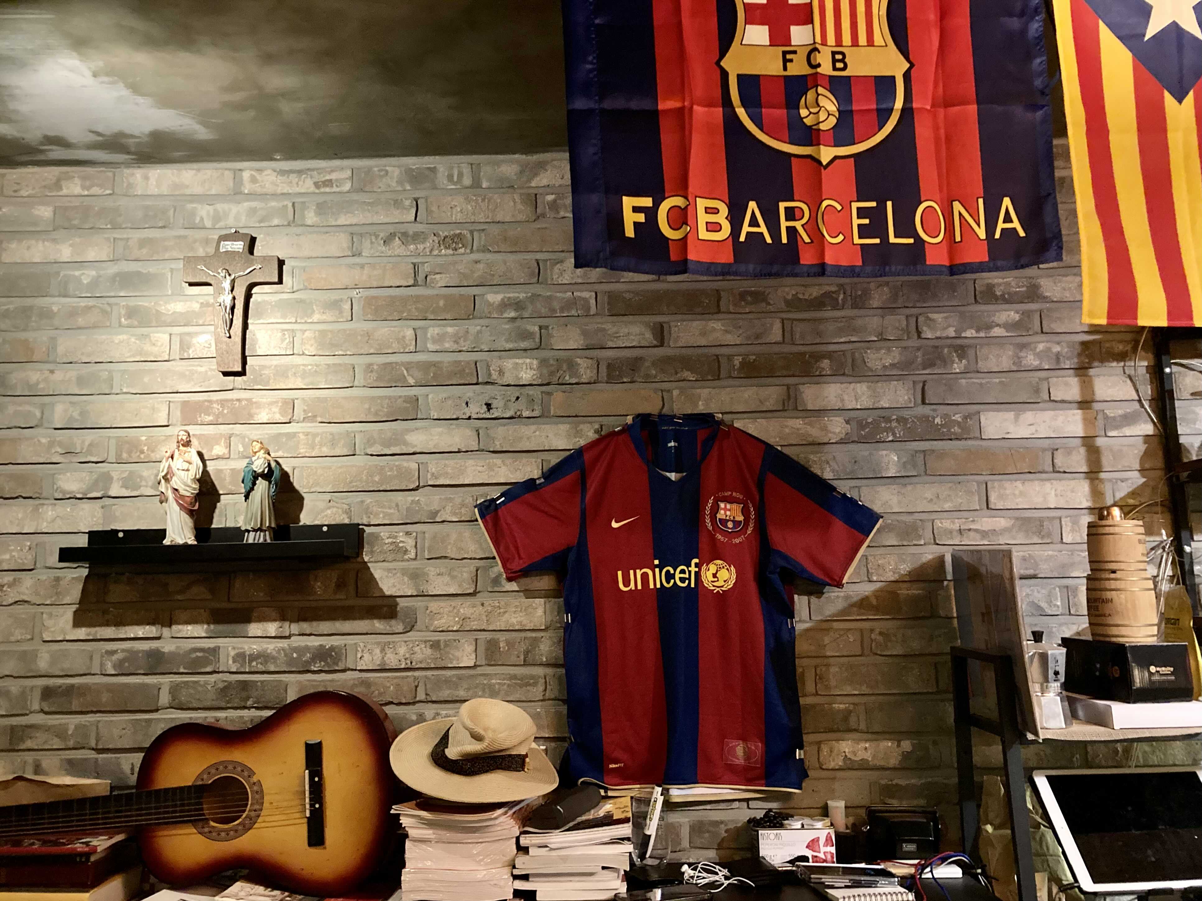 바르셀로나 축구팀 유니폼 걸려 있고,