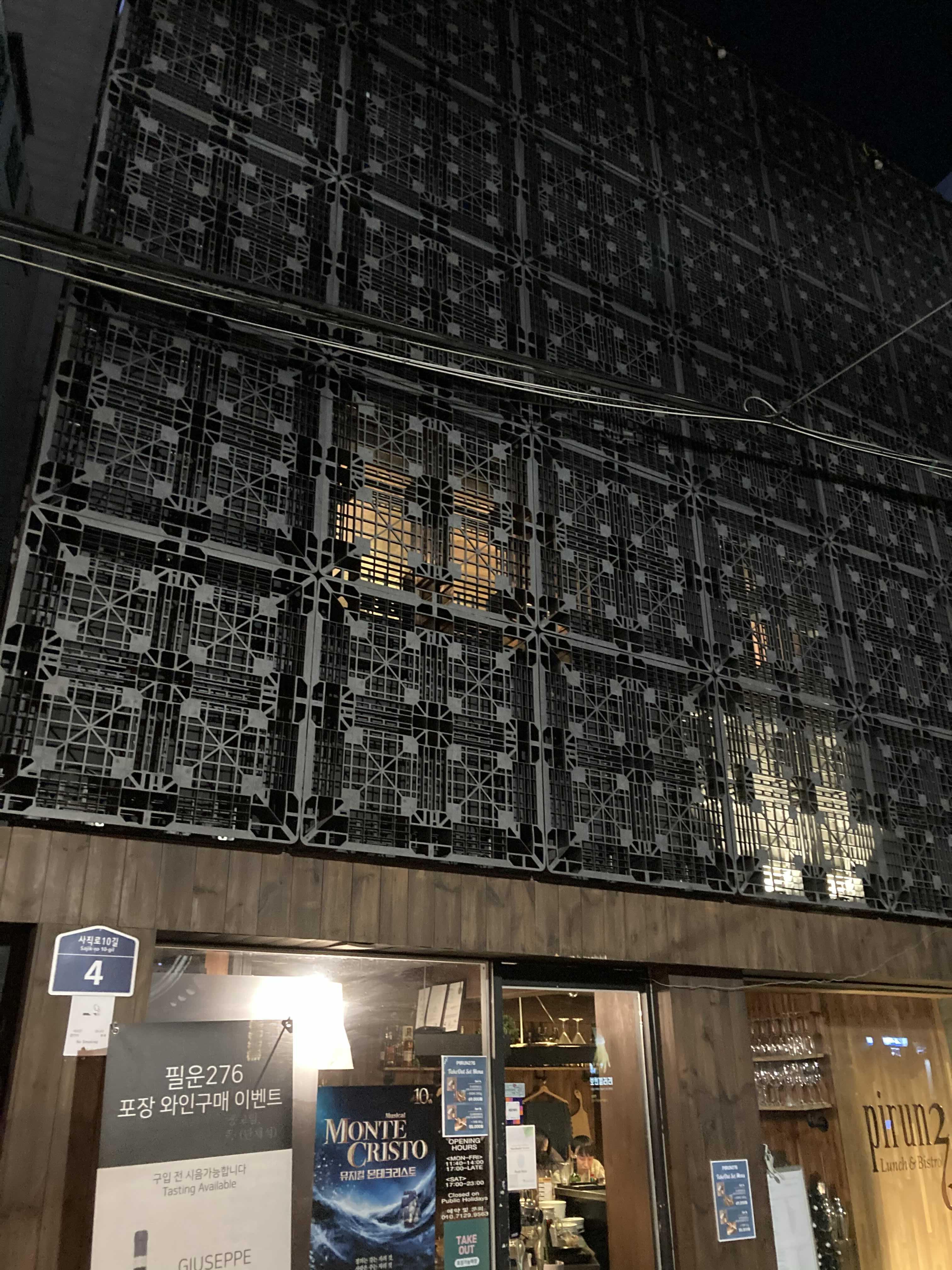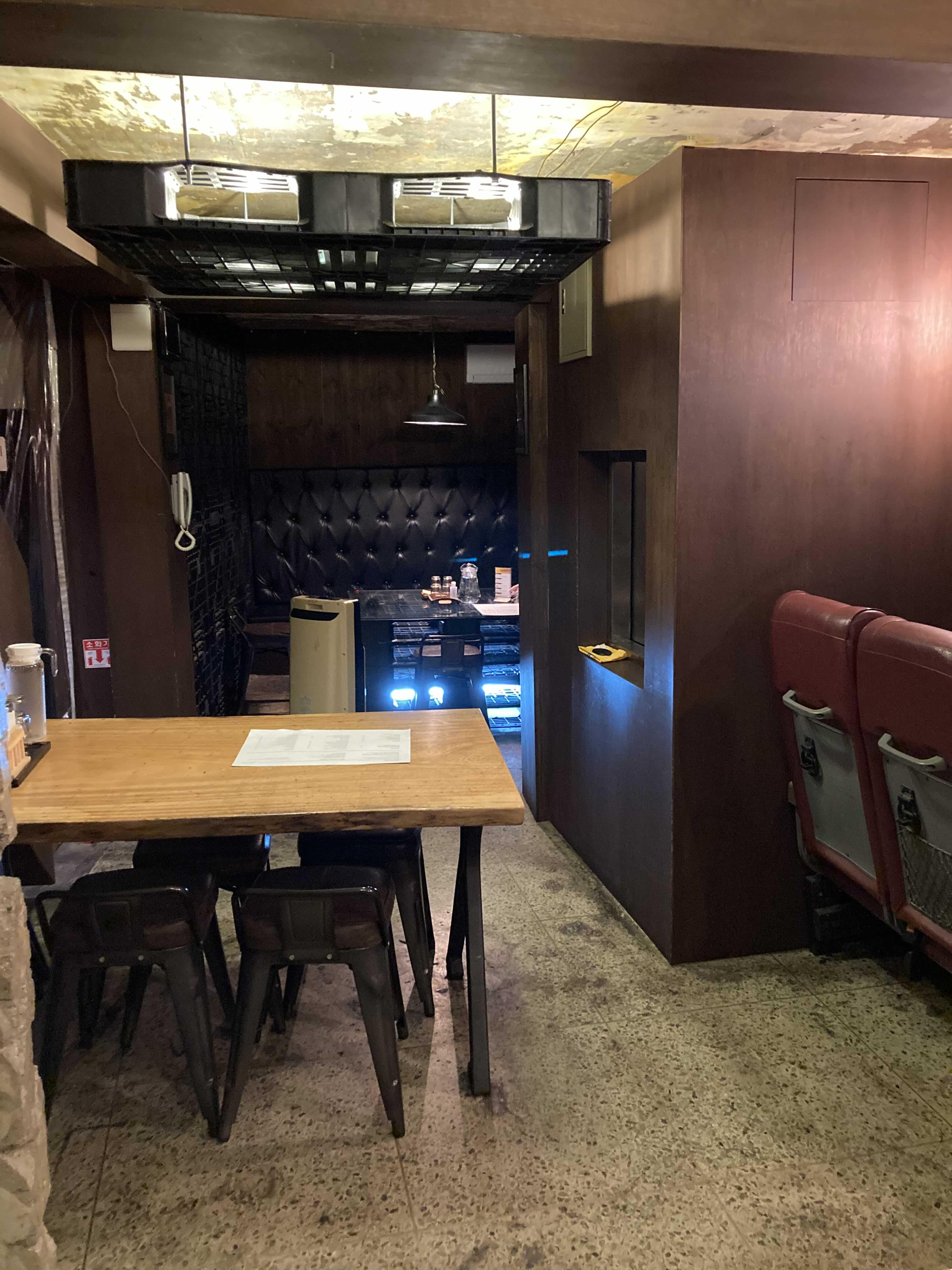 - 가게가 있는 건물 외관이 특이한데, 2층부터는 물류창고에서나 쓸 법한 파레트가 벽에 쭉 붙어있다 (무슨 컨셉인걸까..)