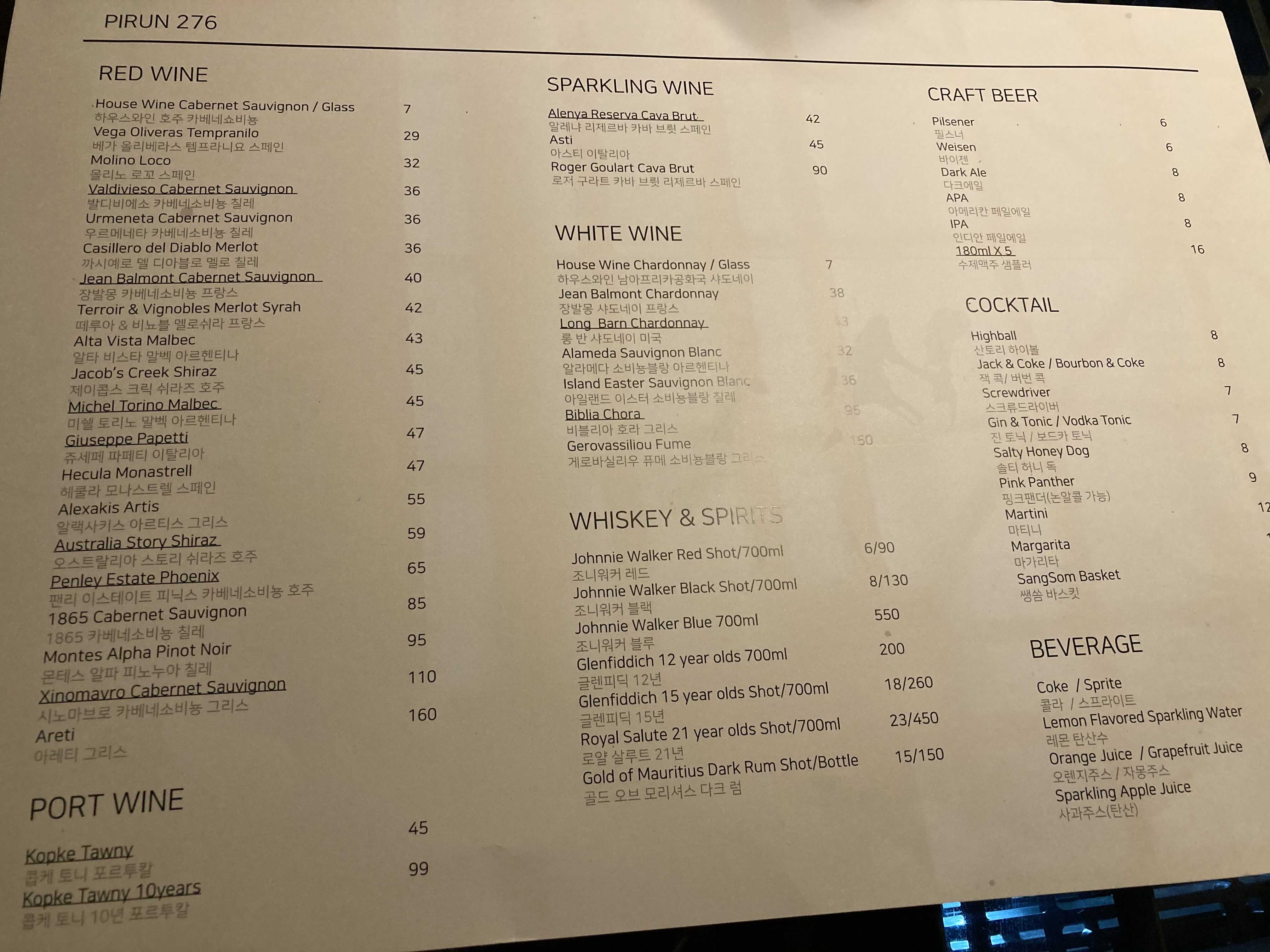 - 주류 메뉴도 진짜 많다. 레드와인, 포트와인, 스파클링, 화이트, 위스키, 맥주, 칵테일..