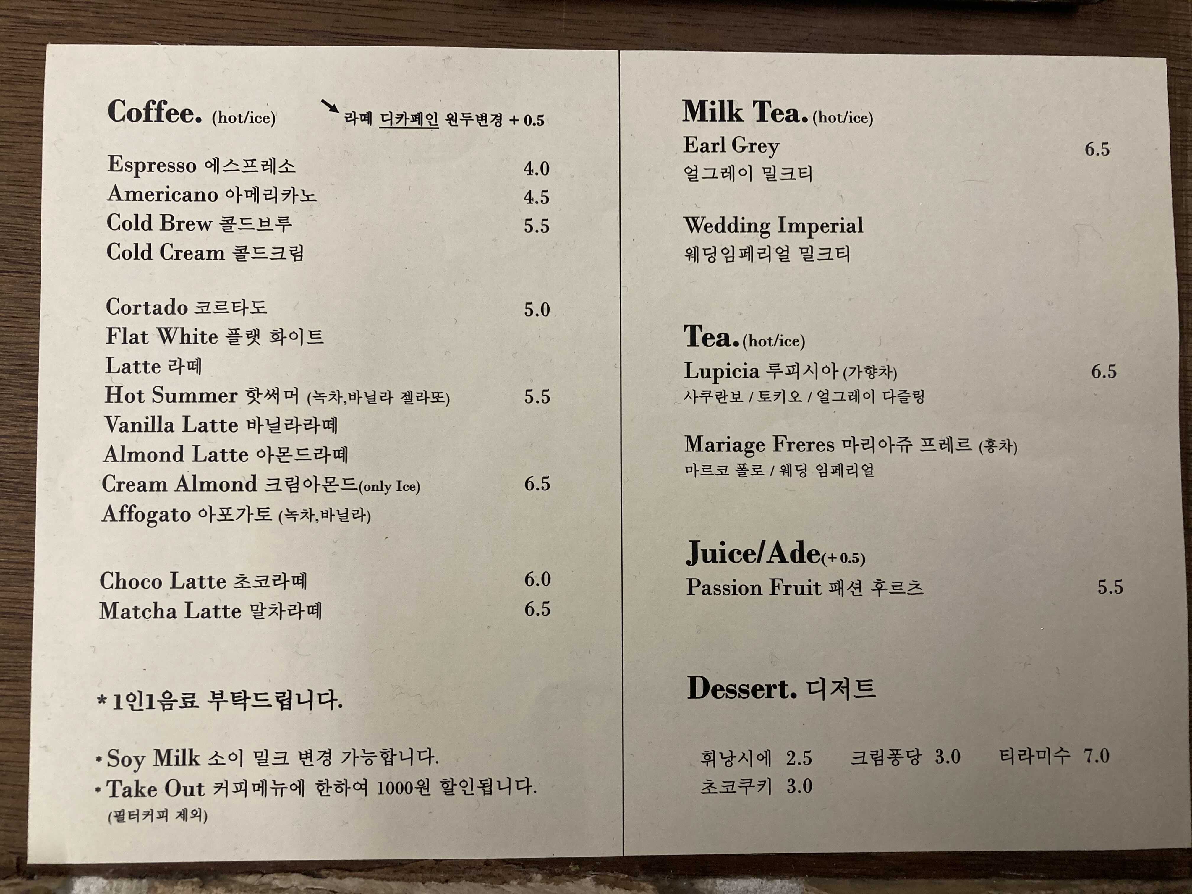 - 메뉴는 기본적인 카페류와 밀크티, 차 그리고 간단한 디저트