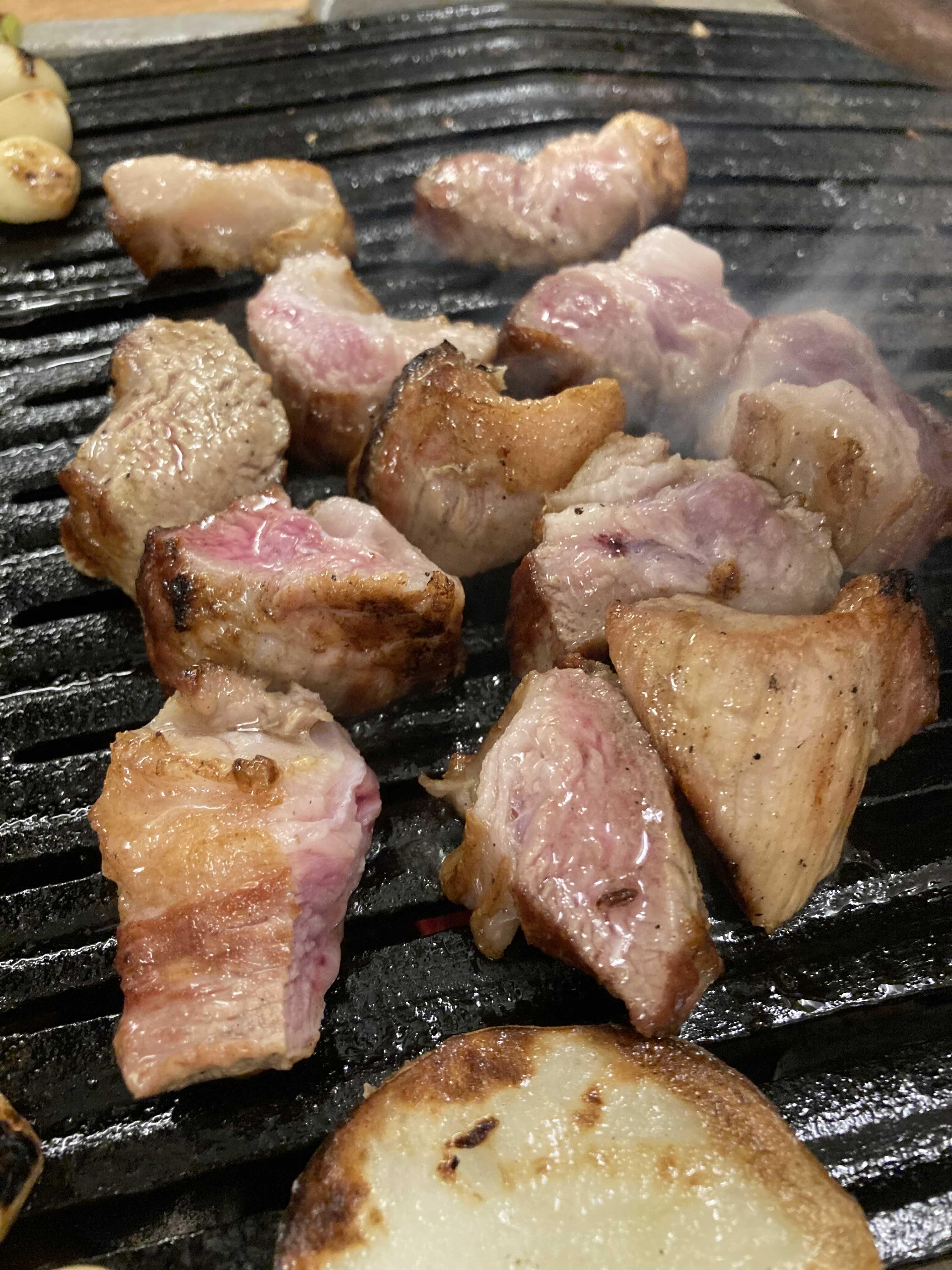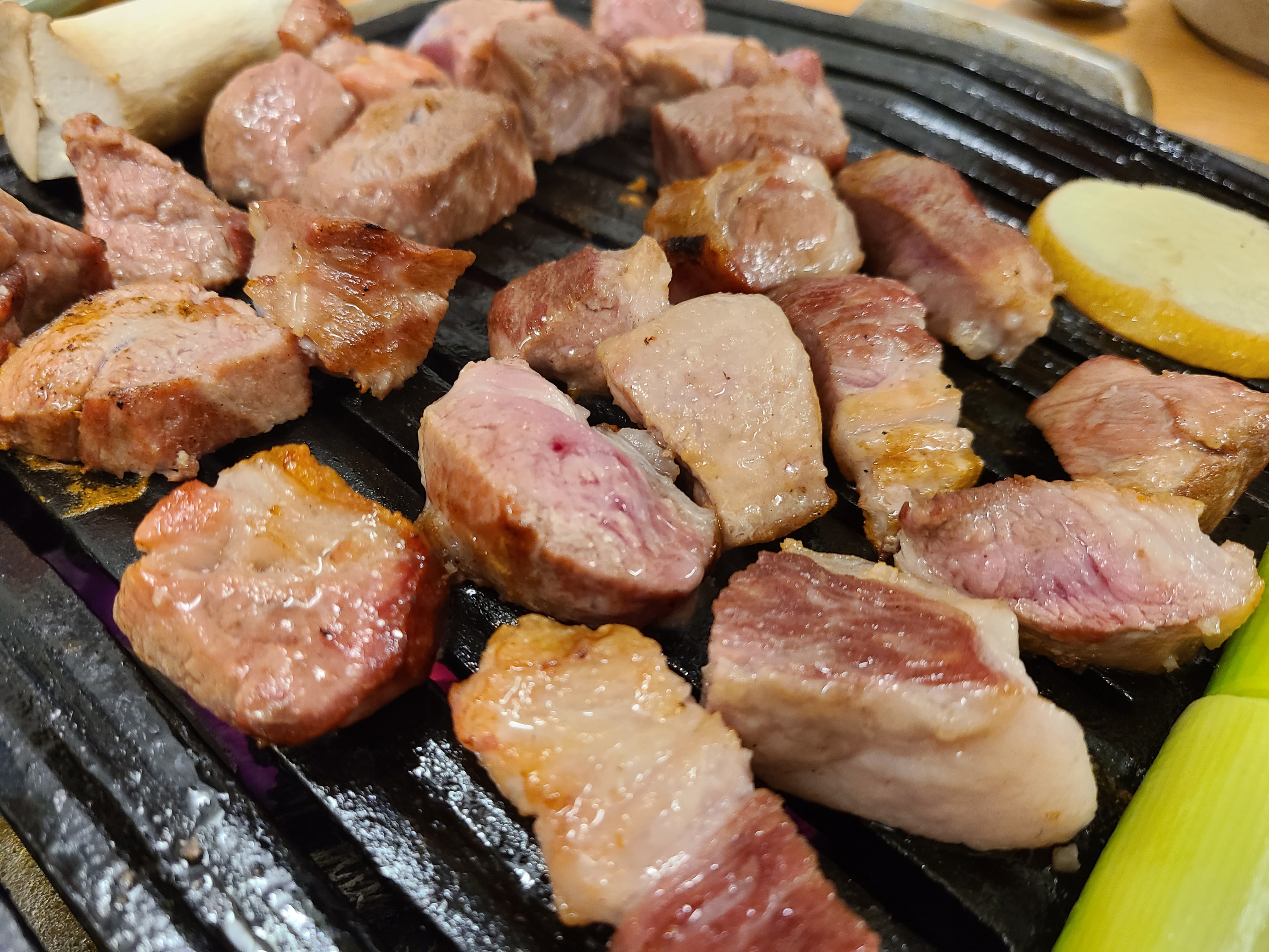 - 우선 목심살과 등심덧살을 시켰다. 감자 2조각, 대파 2조각, 버섯 1개가 같이 나온다.