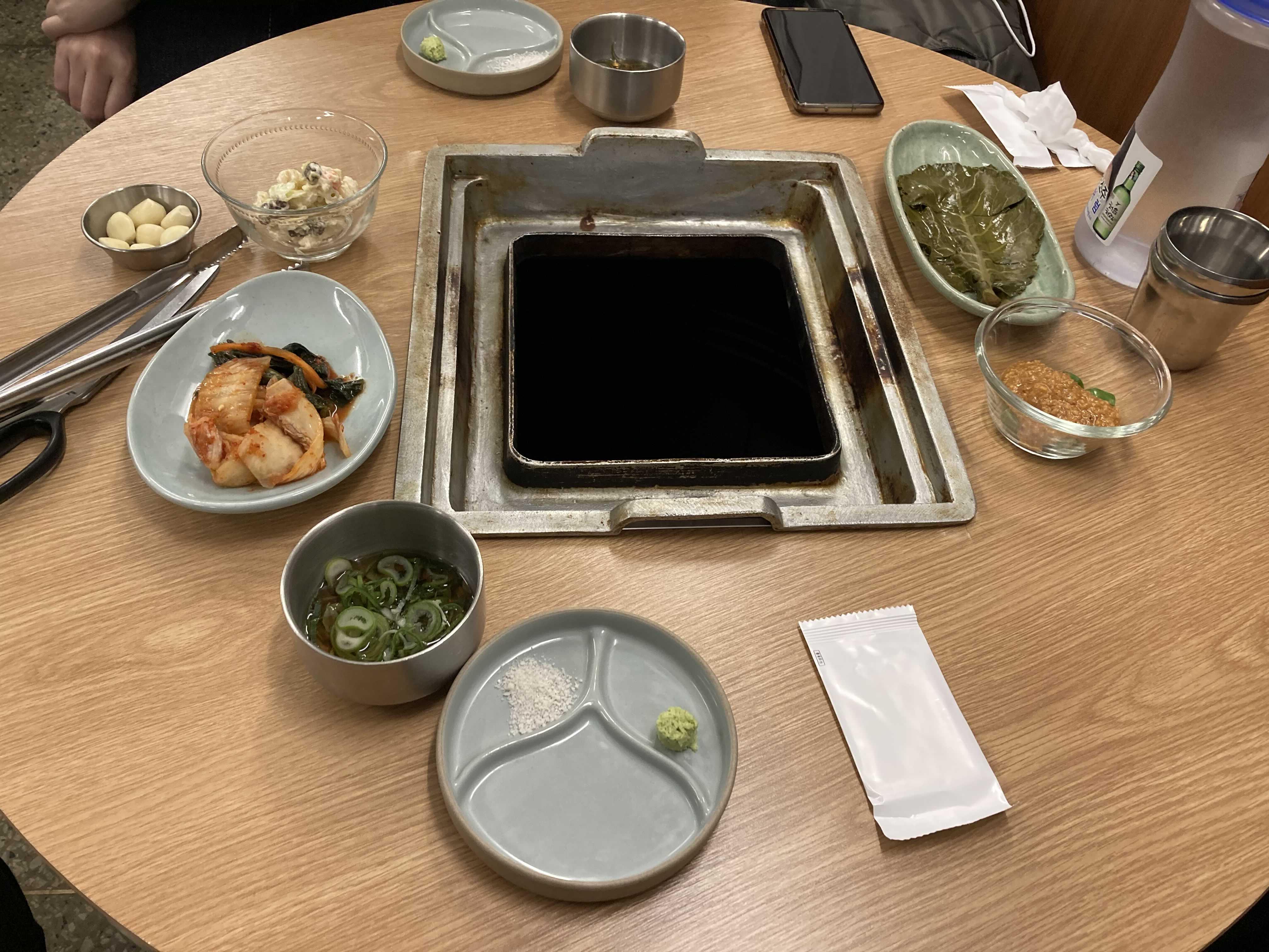 - 심플한 상차림. 김치, 마요네즈 샐러드, 깻잎절임(같은 거), 쌈장, 파절임, 소금 그리고 와사비