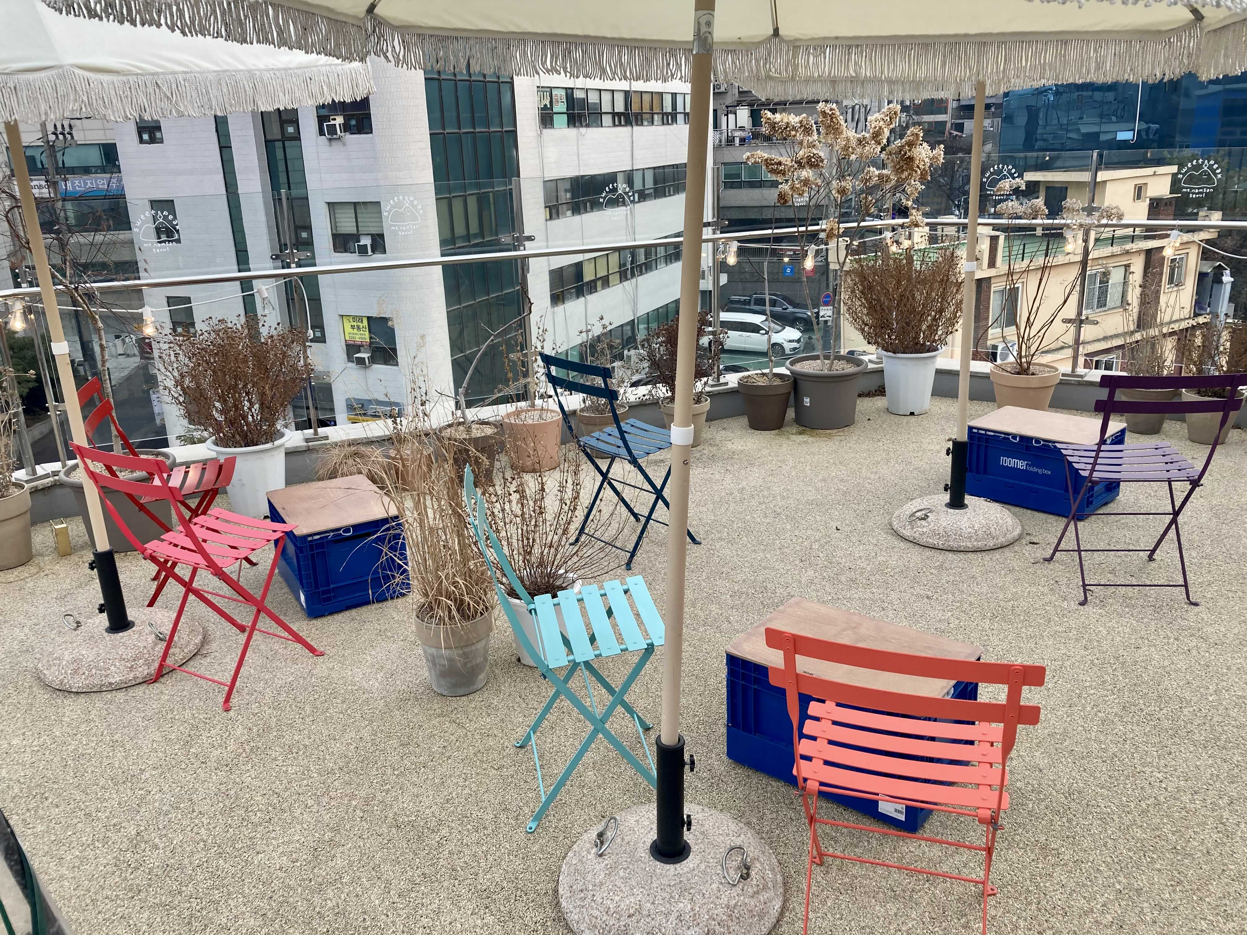 루프탑의 규모가 크진 않지만 알찬 오밀조밀하게 잘 꾸몄다. 파라솔과 철제 의자 그리고 캠핑 박스 같은 스툴들이 놓여있다.
