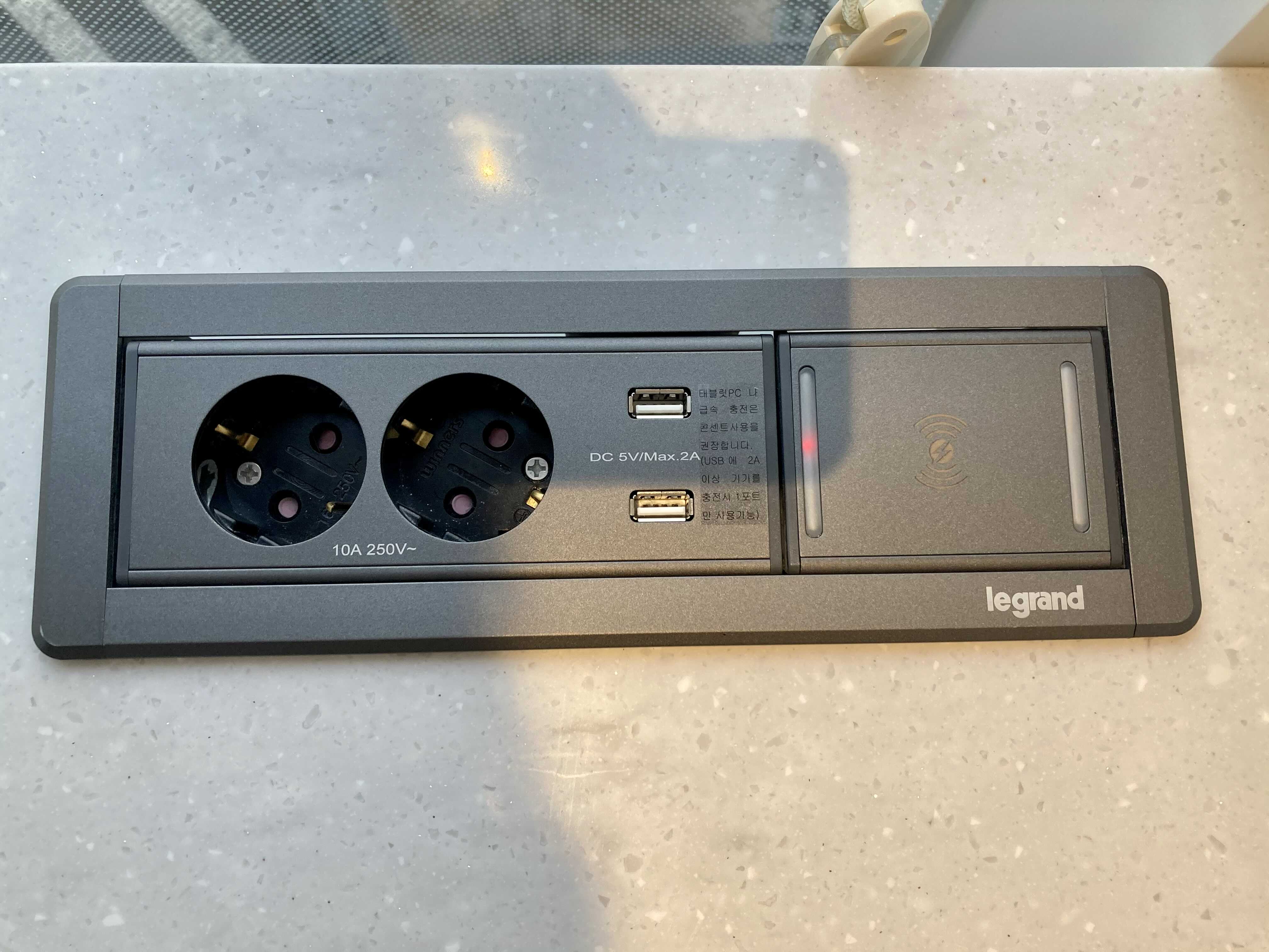 테이블 한 쪽 편에 놓여 있는 콘센트.