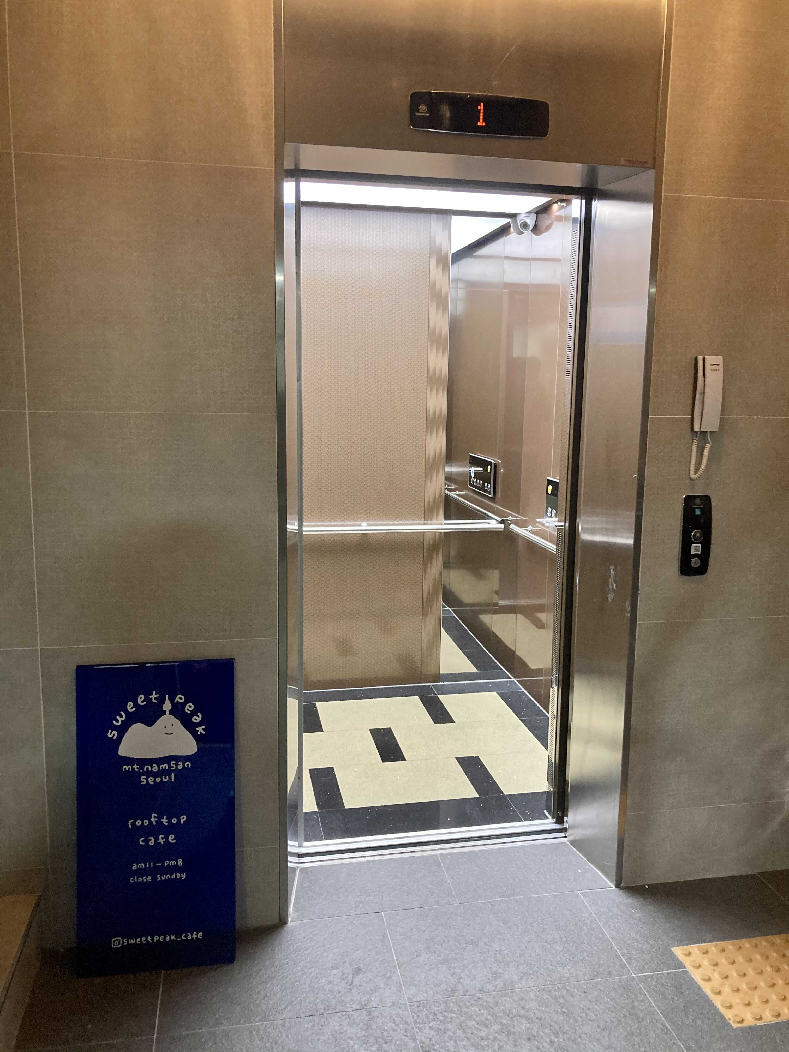 스윗픽은 건물 4층에 있다. 엘리베이터 옆에 스윗픽 입간판이 있다. 엘리베이터도 아주 빤딱빤딱하다.