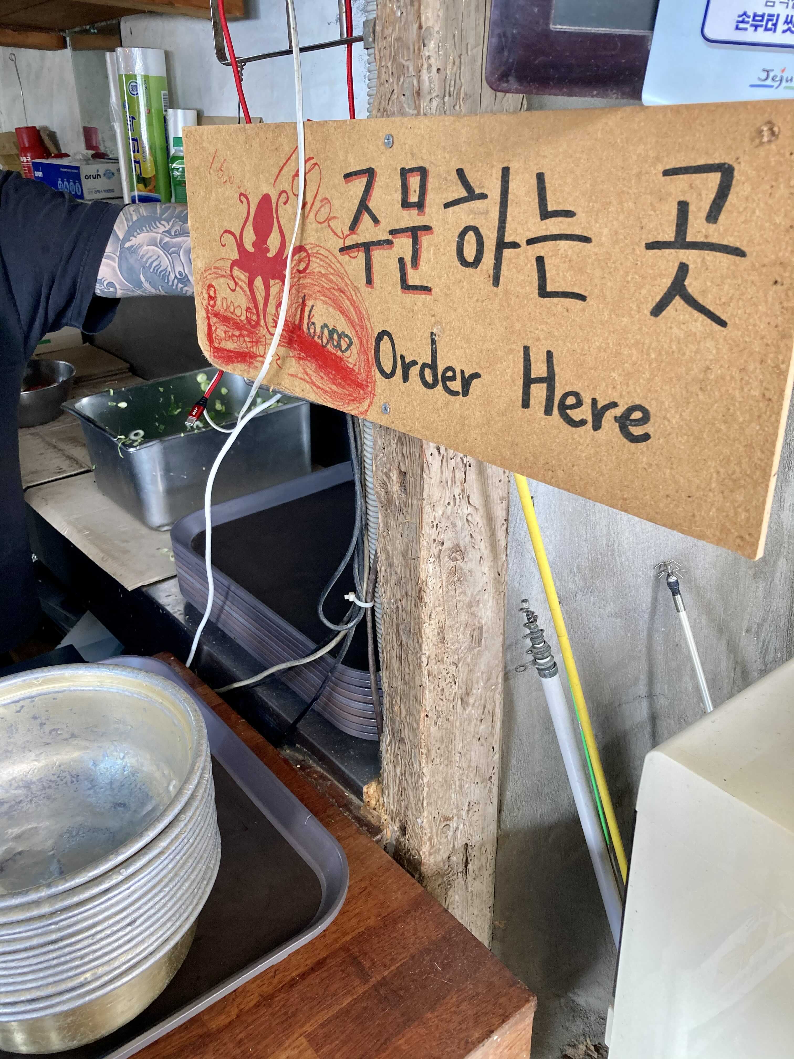 그렇게 가게를 들어가면 메뉴는 뭐고, 어디서 주문을 해야 하는 건지 살짝 헷갈리는 와중에 음료수 냉장고에 적힌 안내문을 발견할 수 있다.