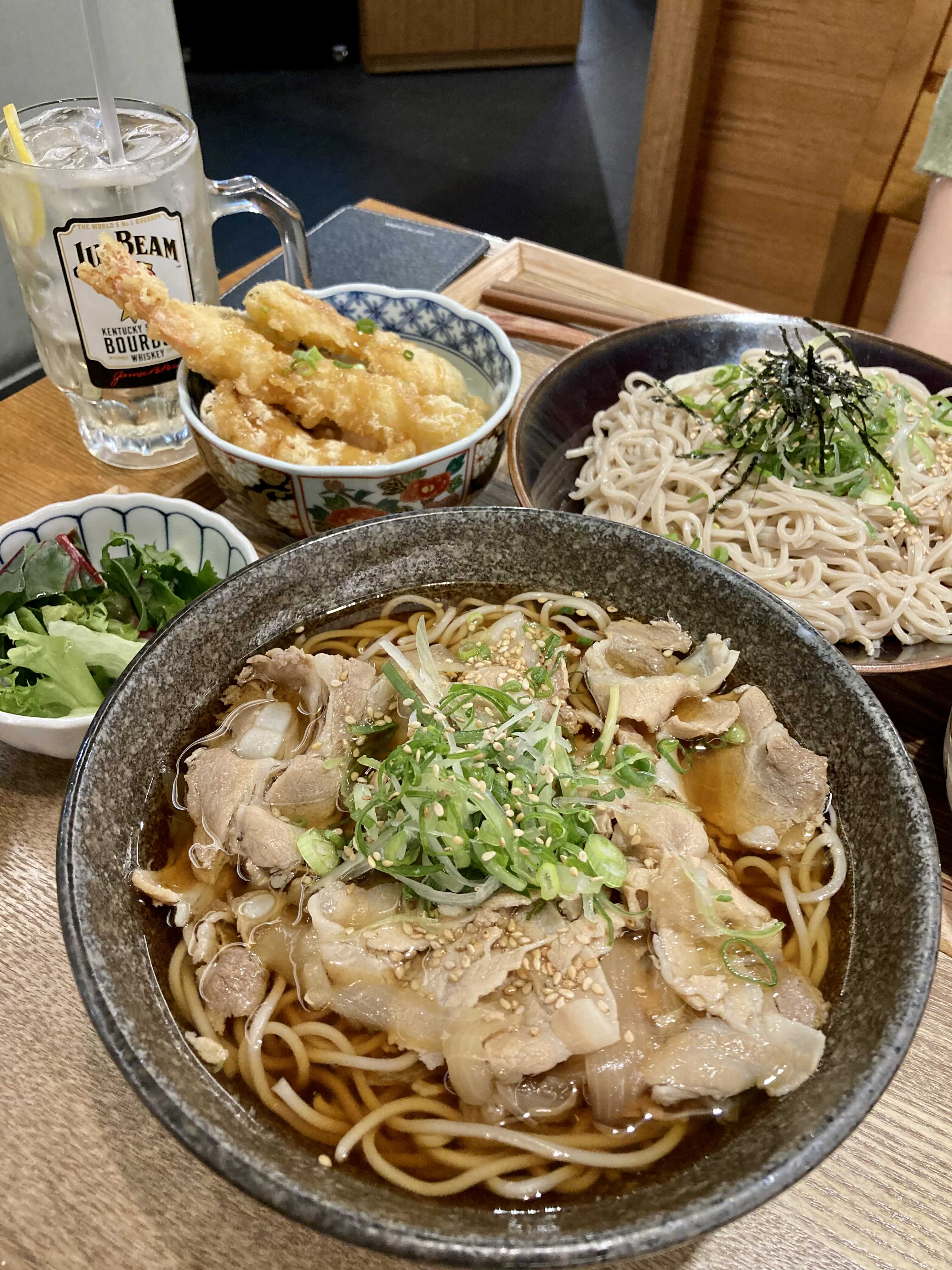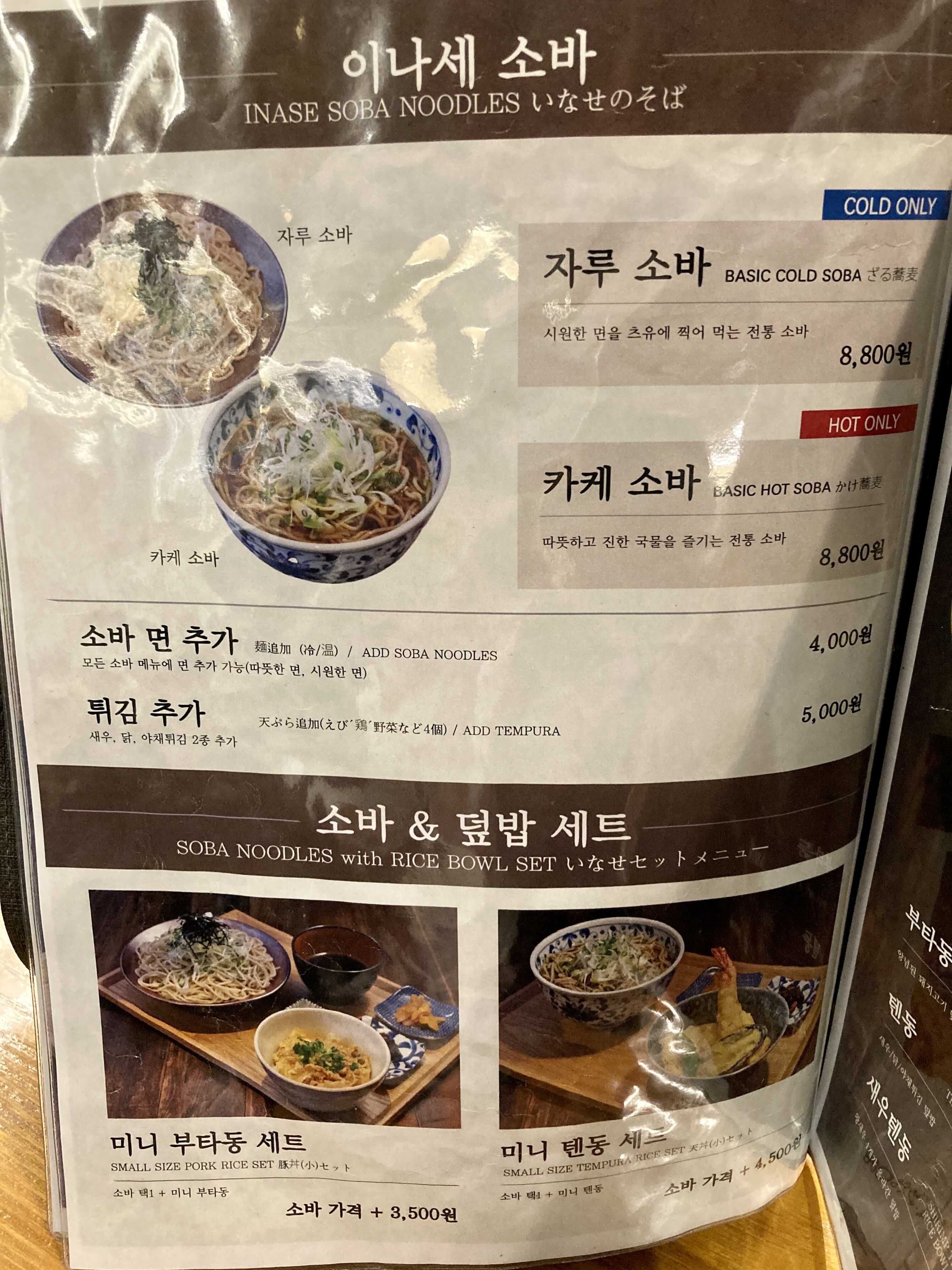 고기 소바, 튀김 소바, 미역 참마 소바 3종류.