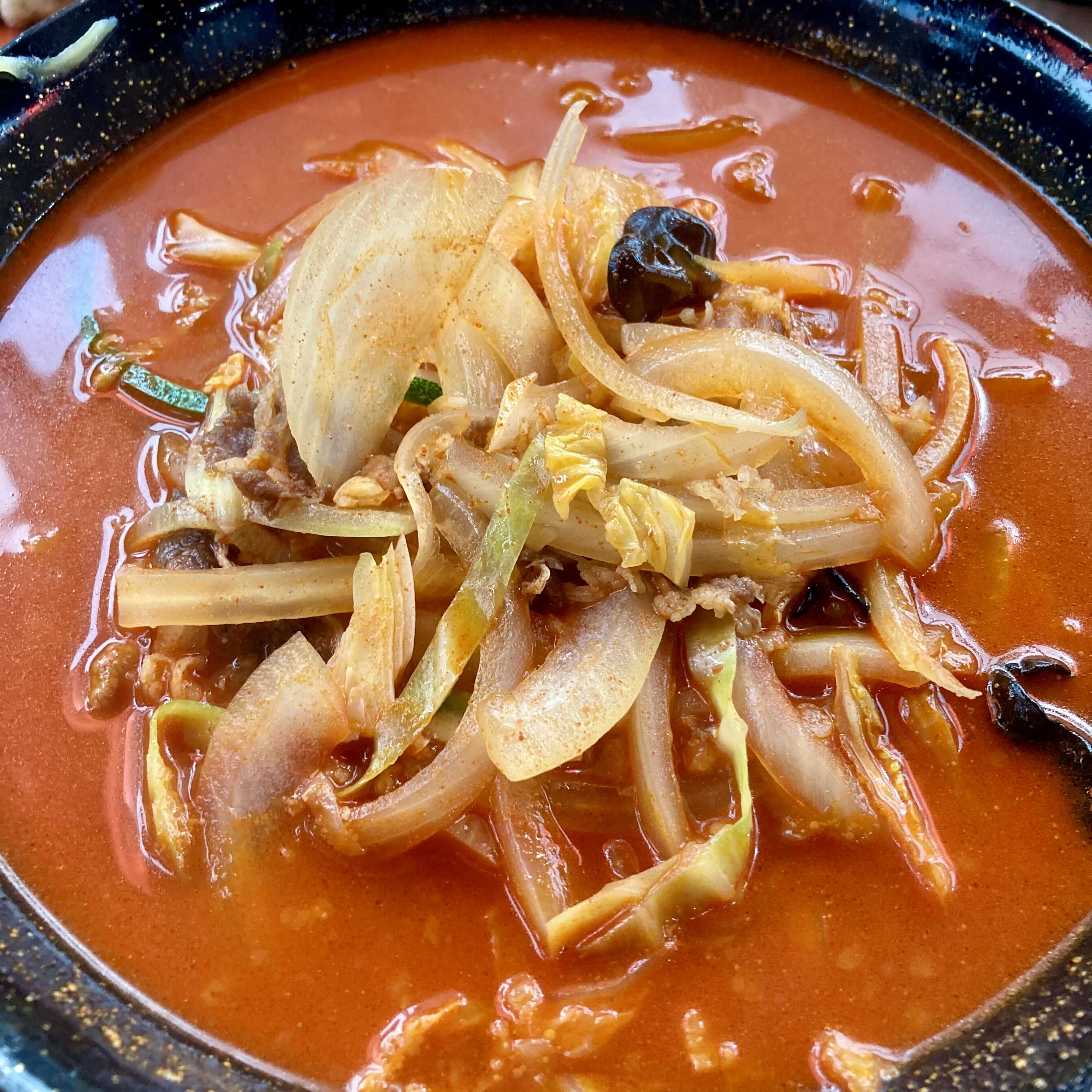 얼큰한 국물과 고기, 야채 고명이 푸짐한