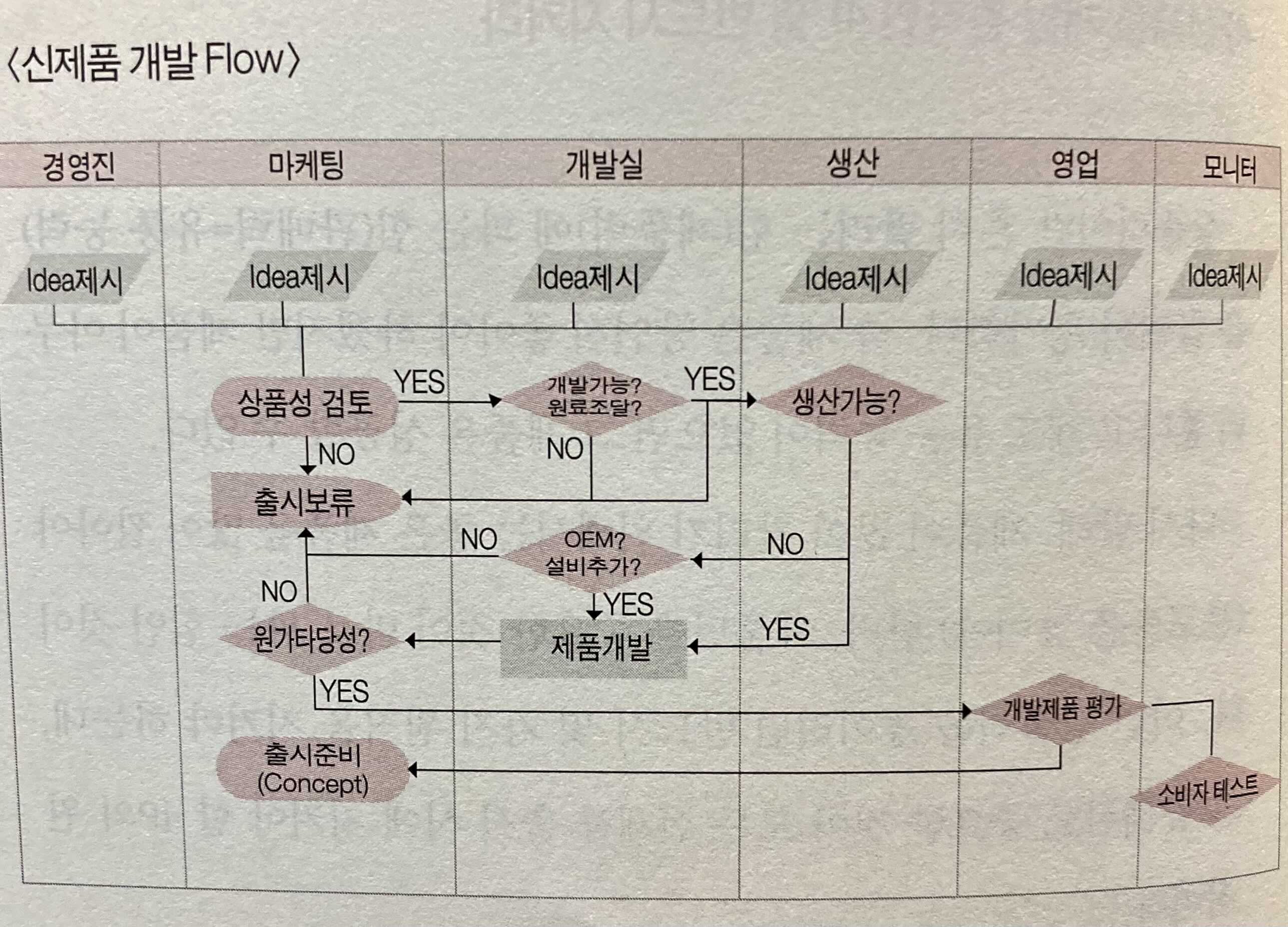 Idea 제안은 전 부서에서 이뤄지고, 마케팅 부서가 개발 관련 업무를 전반적으로 리드한다. 해당 Flow chart만 보면 신제품 개발 과정이 생각보다 간단해 보인다. 하지만 각 단계 별로 수많은 절차와 업무가 있다고 생각하면, 신제품 개발에 수많은 input이 들어갈 것이다. (이렇게 해서 잘되면 다행이긴 하지만, 잘 안되면..)