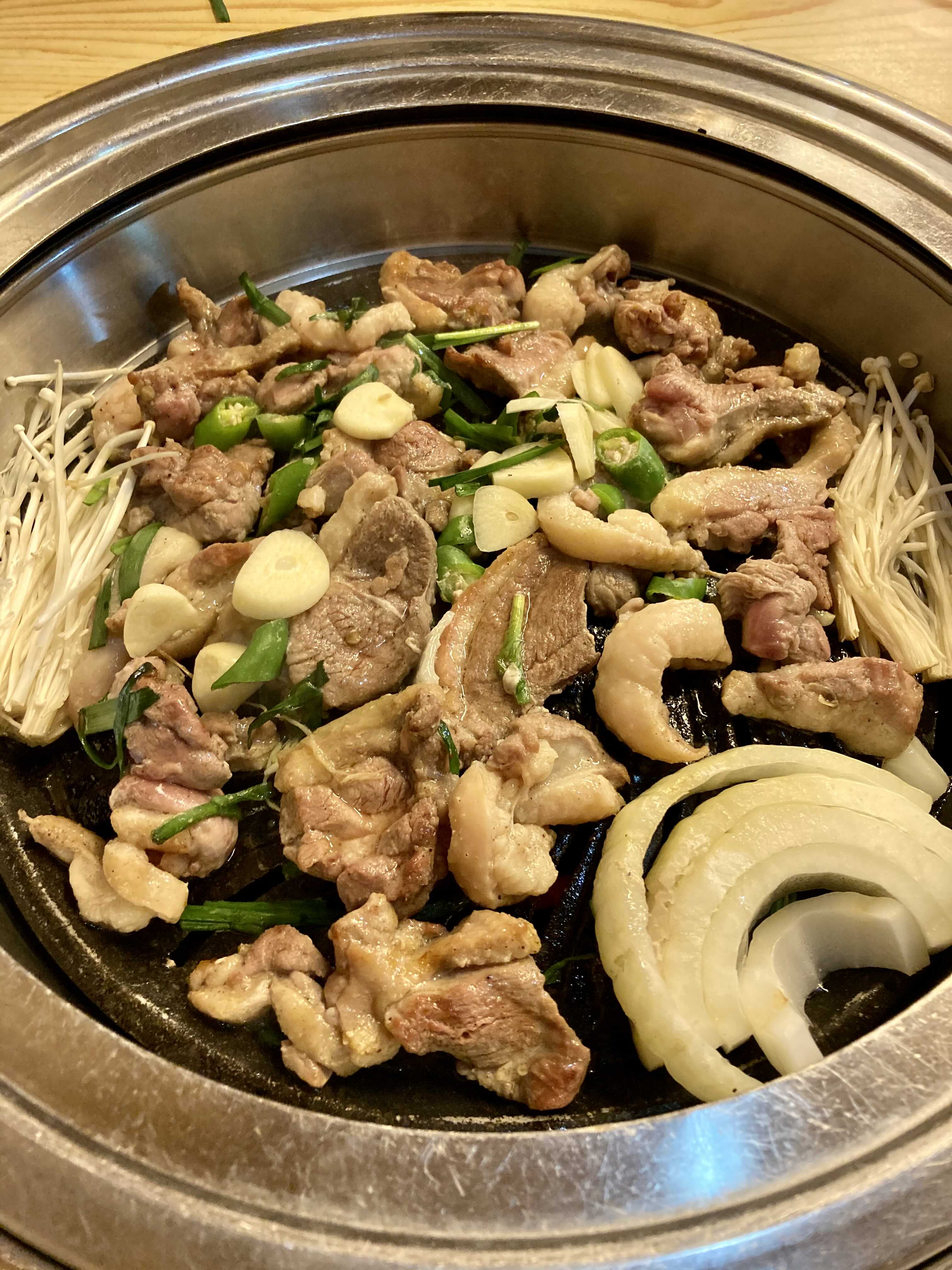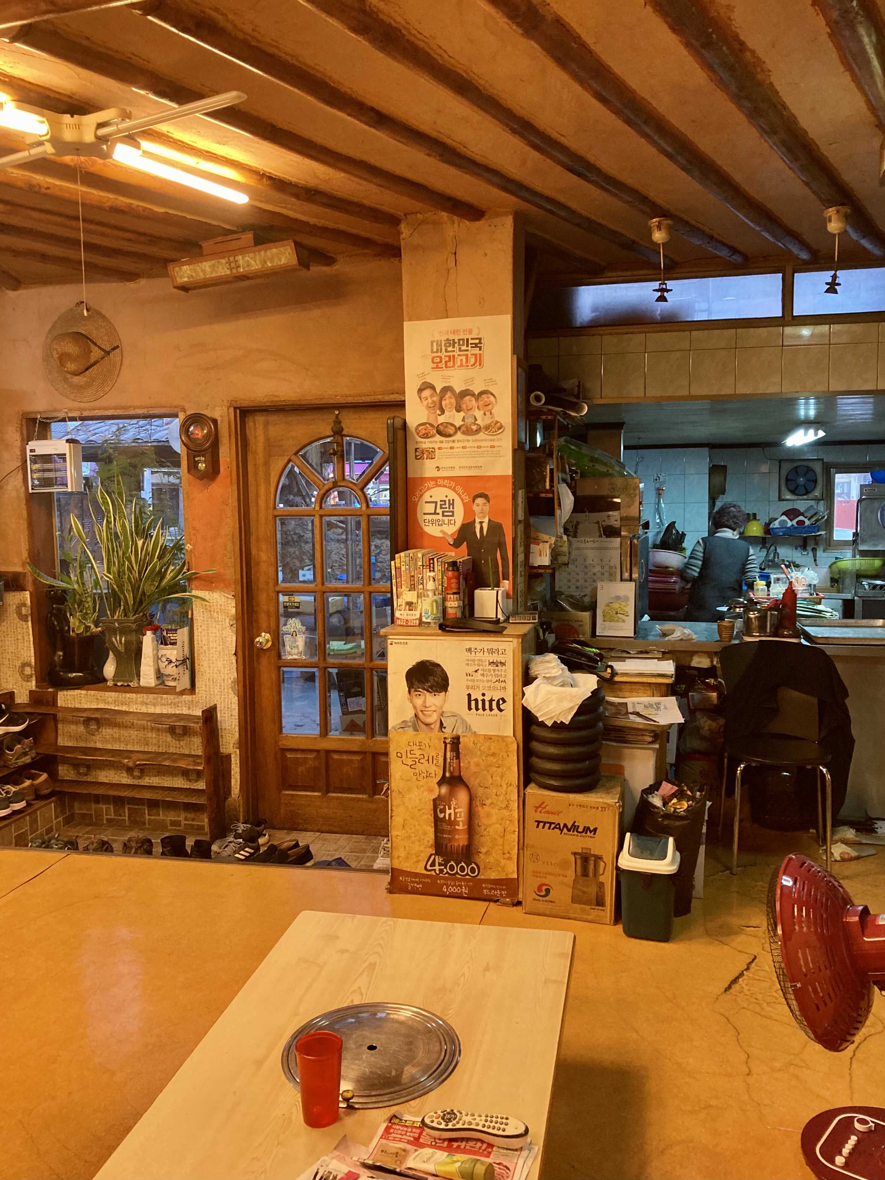 (고기를 다 먹어 갈 때쯤 사장님께 오리탕을 요청한다)