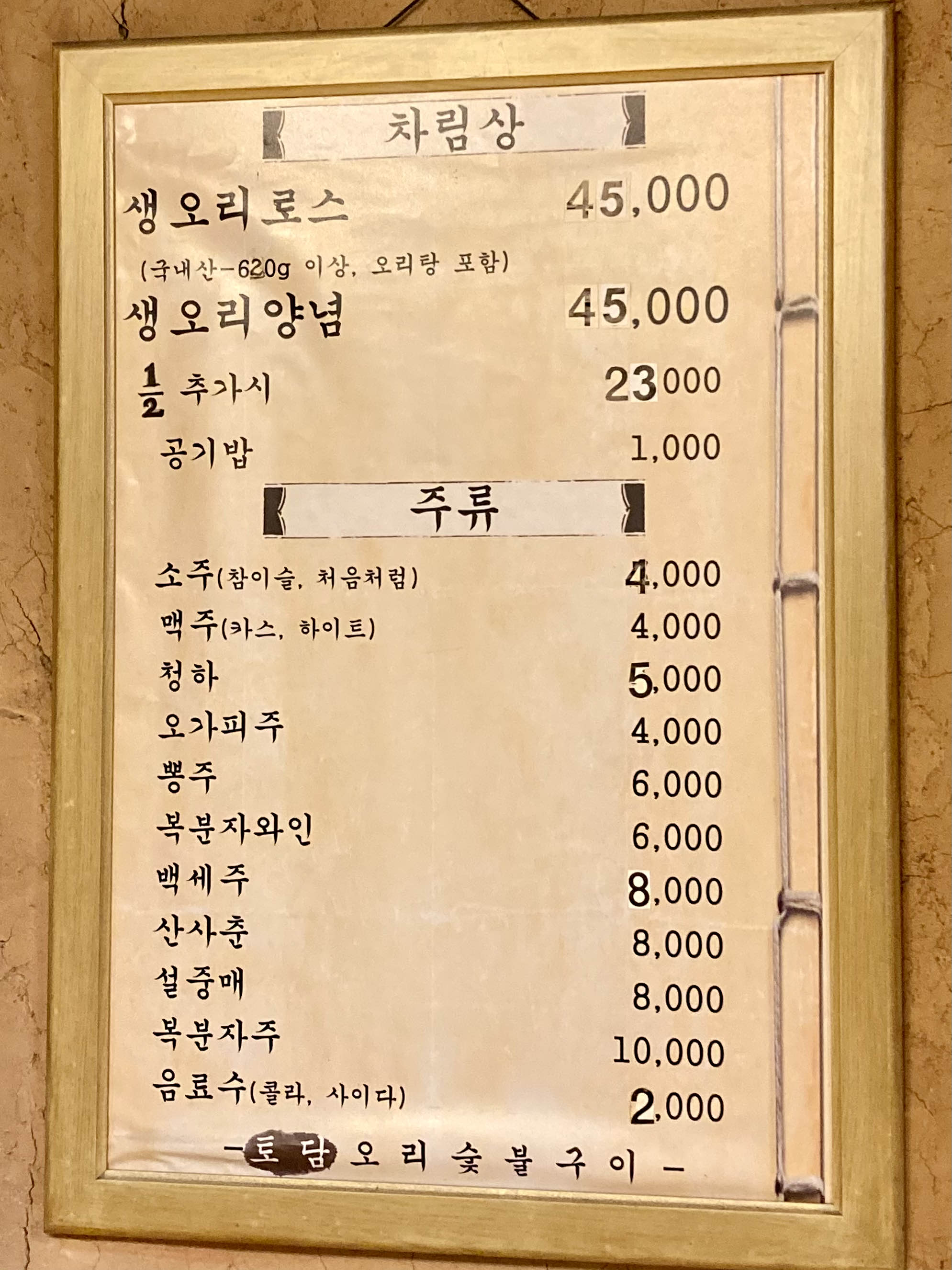 대흥역 맛집 토담오리숯불구이의 메뉴판.